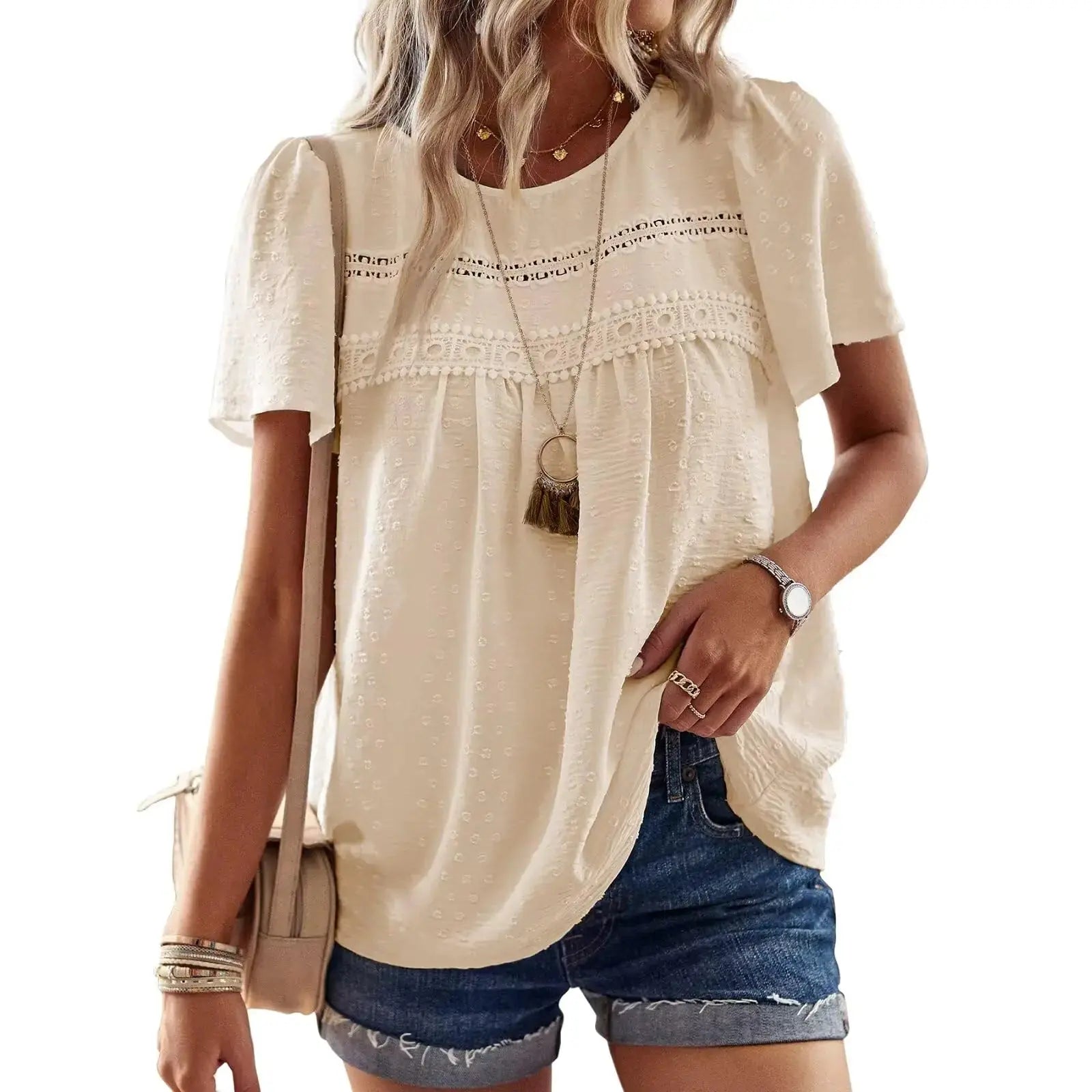 Womens Summer Tops Crewneck Short Sleeve Shirts | Casual Chiffon Blouses Flowy Lace Hem Boho Clothing