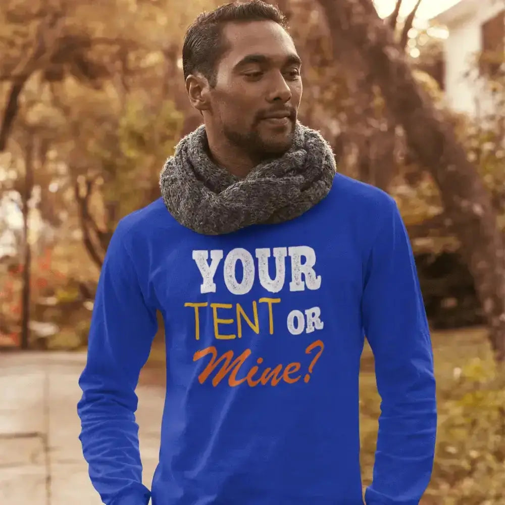 Introducing the "Your Tent or Mine" Men's Long Sleeve Shirt! This versatile shirt combines fashion-forward design with comfort. It features a captivating camping-inspired design and is made from premium-quality fabric for optimal comfort. Dress it up or down for a stylish look that's perfect for any occasion.